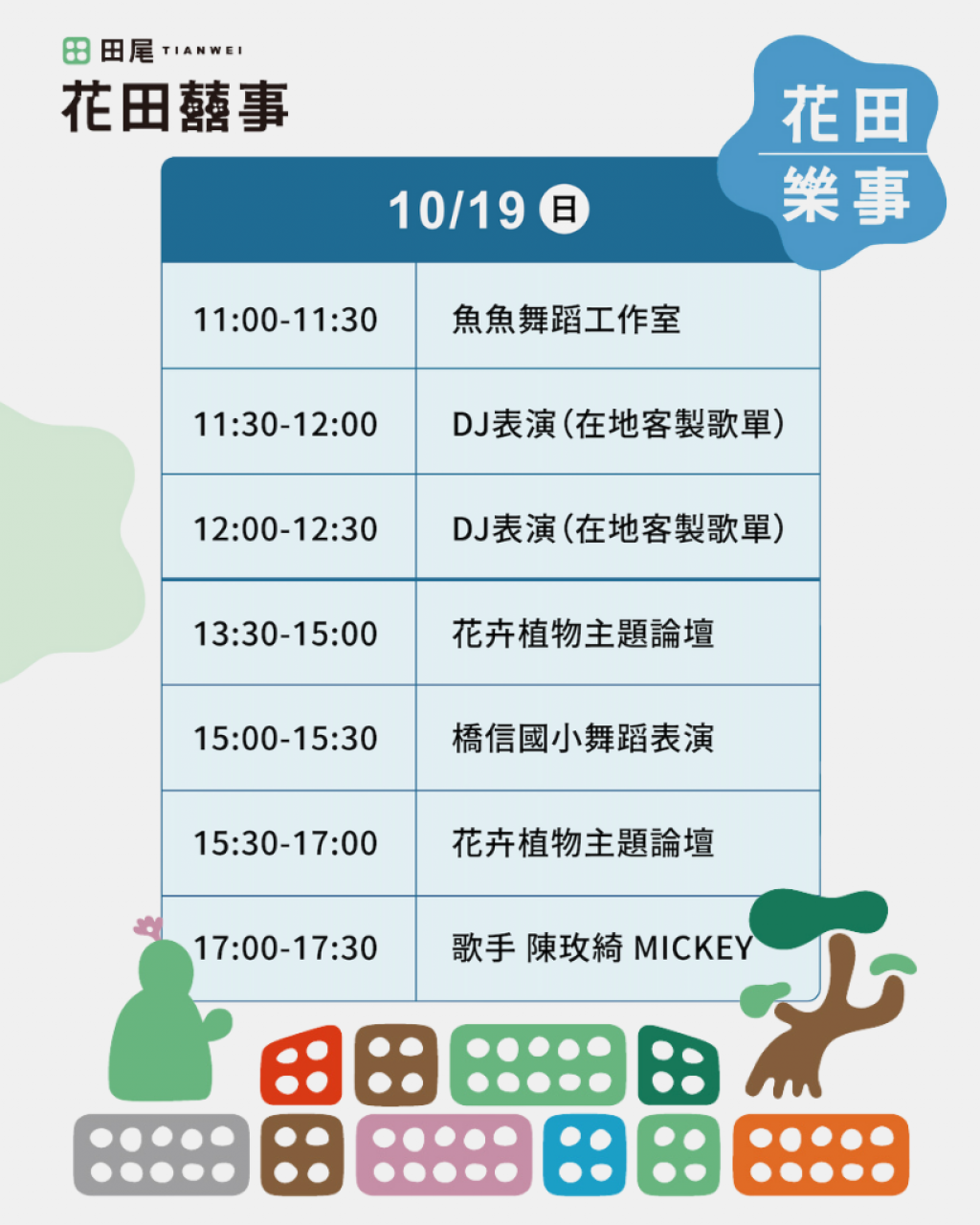 「2025台灣設計展」系列活動(((田尾行|花田囍事)))即將在114年10月18日、19日10:00-18:00在隆盛樹化玉博物館舉辦「花田集市」及「花田樂事」活動,內容包含在地商家花卉植栽市集與現場音樂表演,邀請民眾及同仁共度花田假期。