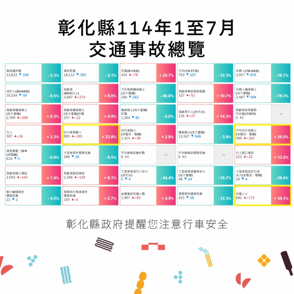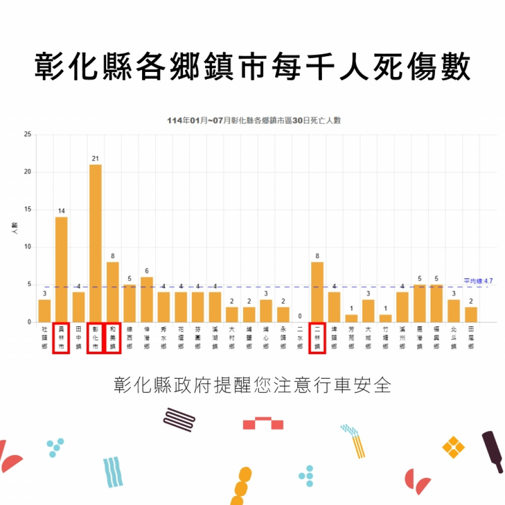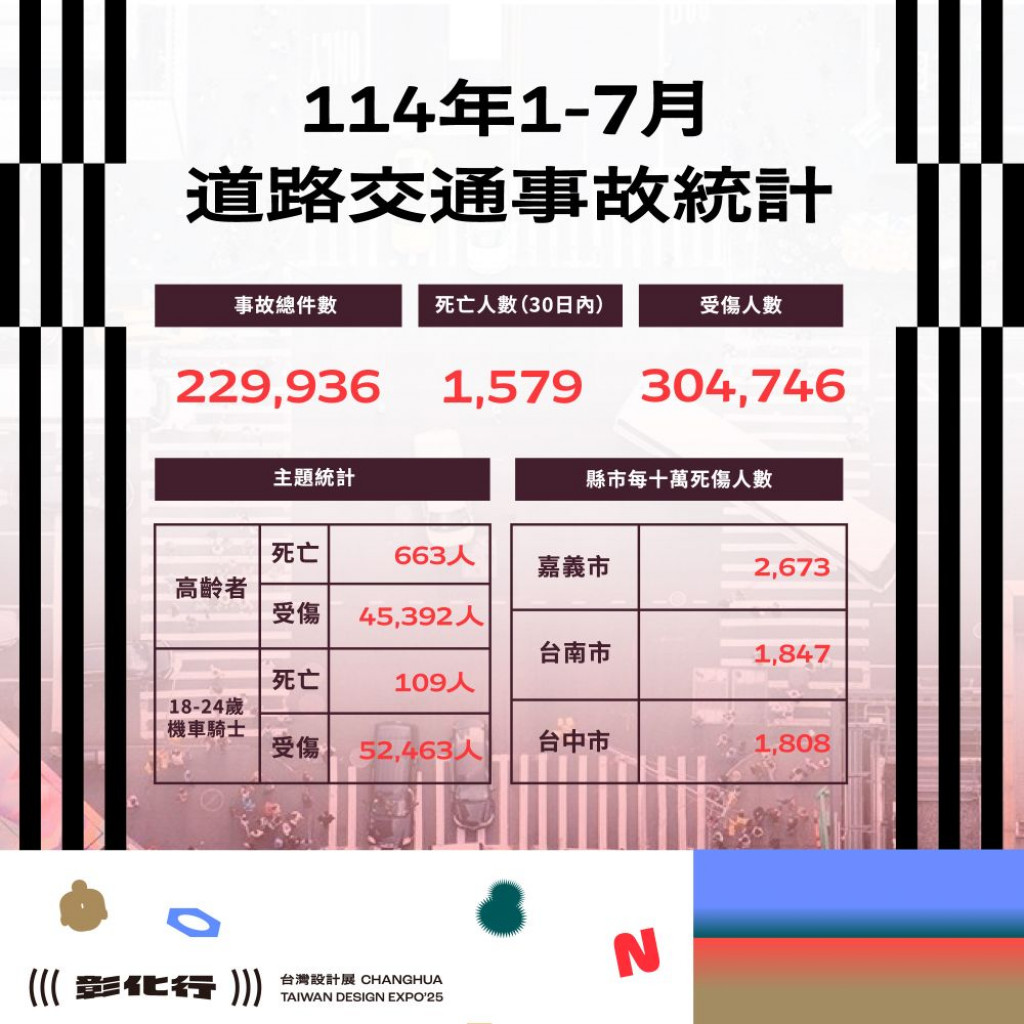 附件為「114年1-7月全國道路交通事故統計、彰化縣交通事故總覽、本縣各鄉鎮市每千人死傷人數及肇事熱點」共4份統計資料宣導圖,社群宣導內容可參閱或分享本處「花現彰化-2025台灣設計展」(https://www.facebook.com/chcginformation)臉書粉絲專頁。 |
