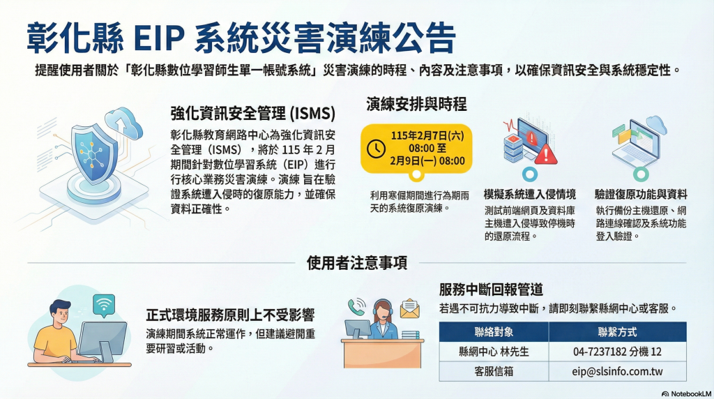 三、影響範圍:雖於寒假期間演練,正常情況下不影響正式環境之系統服務,仍有不可抗力之風險,請使用者避免於演練日期操作或辦理重要相關研習與活動。